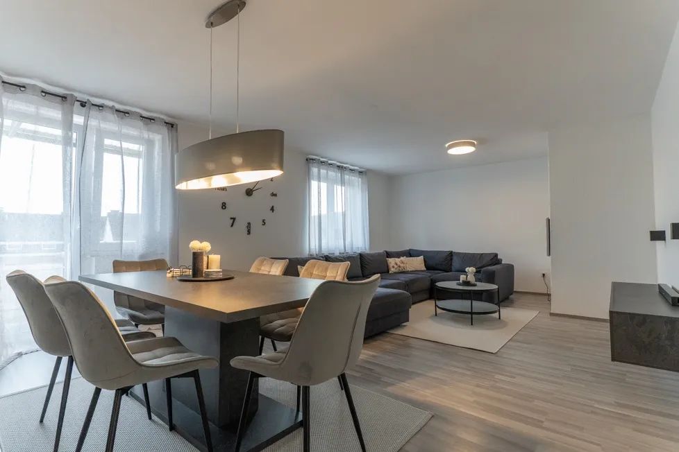Sie betreten die schicke, renovierte Wohnung und gelangen von der geräumigen Diele zur linken Seite in das große Schlafzimmer, das Duschbad und die Wohnküche mit dem Ausgang zu einem der beiden Balkone mit schönem Blick über die Stadt. Vom Eingang aus gesehen zur rechten Seite befinden sich zwei helle Kinderzimmer, ein weiteres Badezimmer mit Wanne […]